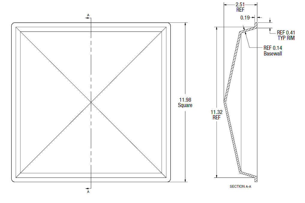 Size: 12-3/8″ x 12-3/8″ NOMINAL; Depth: 2.51″ (Drop inside size: 11.5″ x 11.5″)