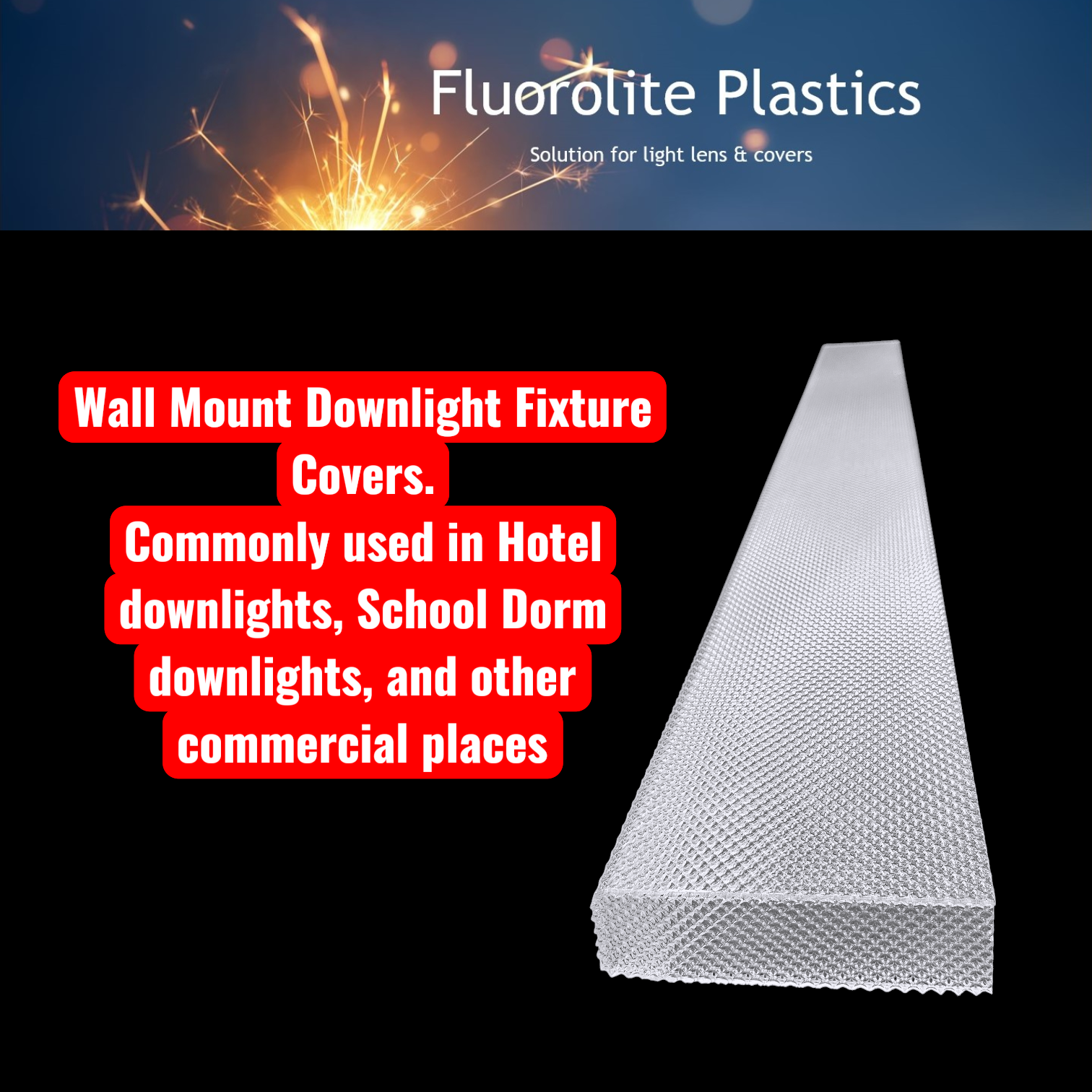 - Widely used as dorm lighting diffuser, hotel hallway downlight cover, and institutional wall mounted lighting solution