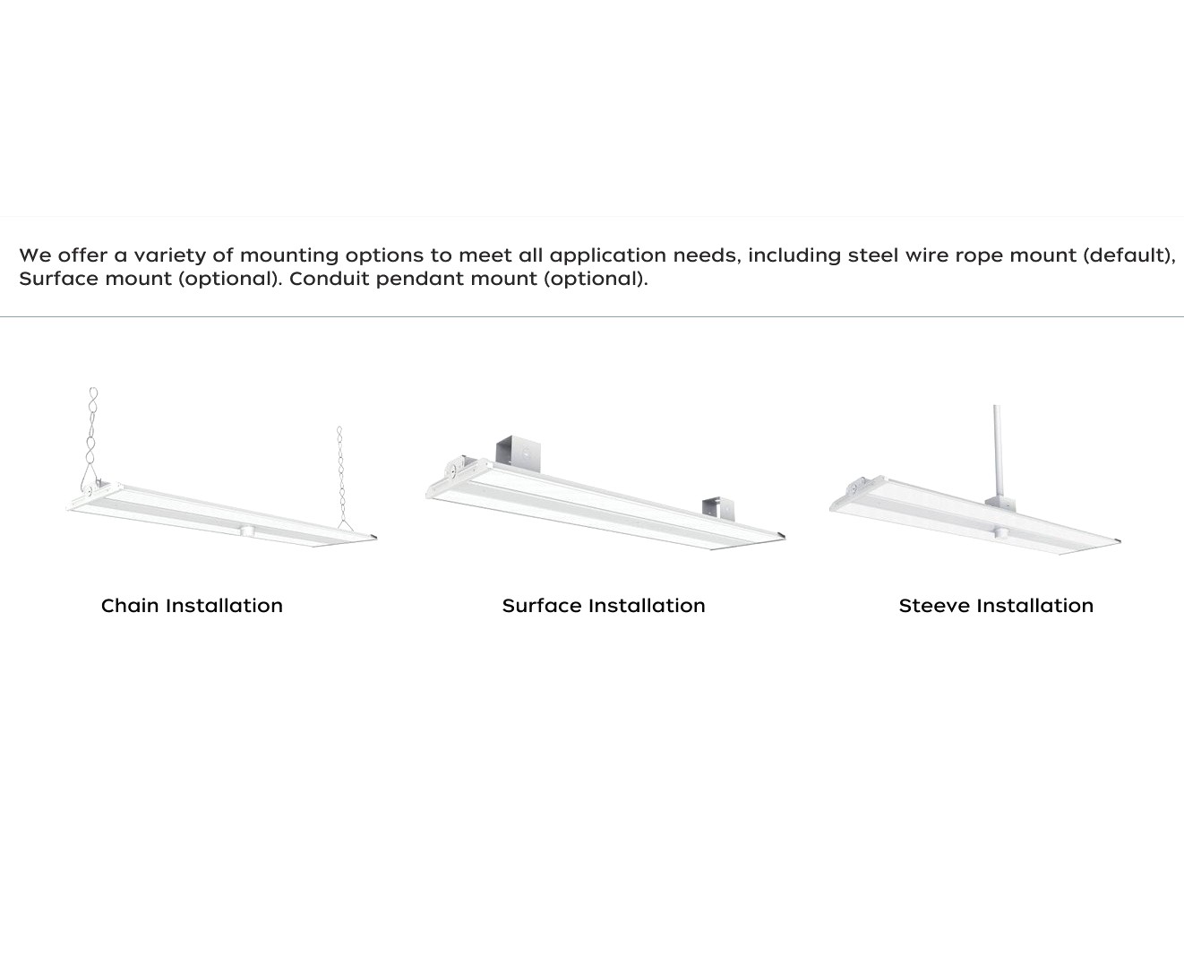 A: Steel wire-rope suspension is standard; surface-mount hardware is optional.