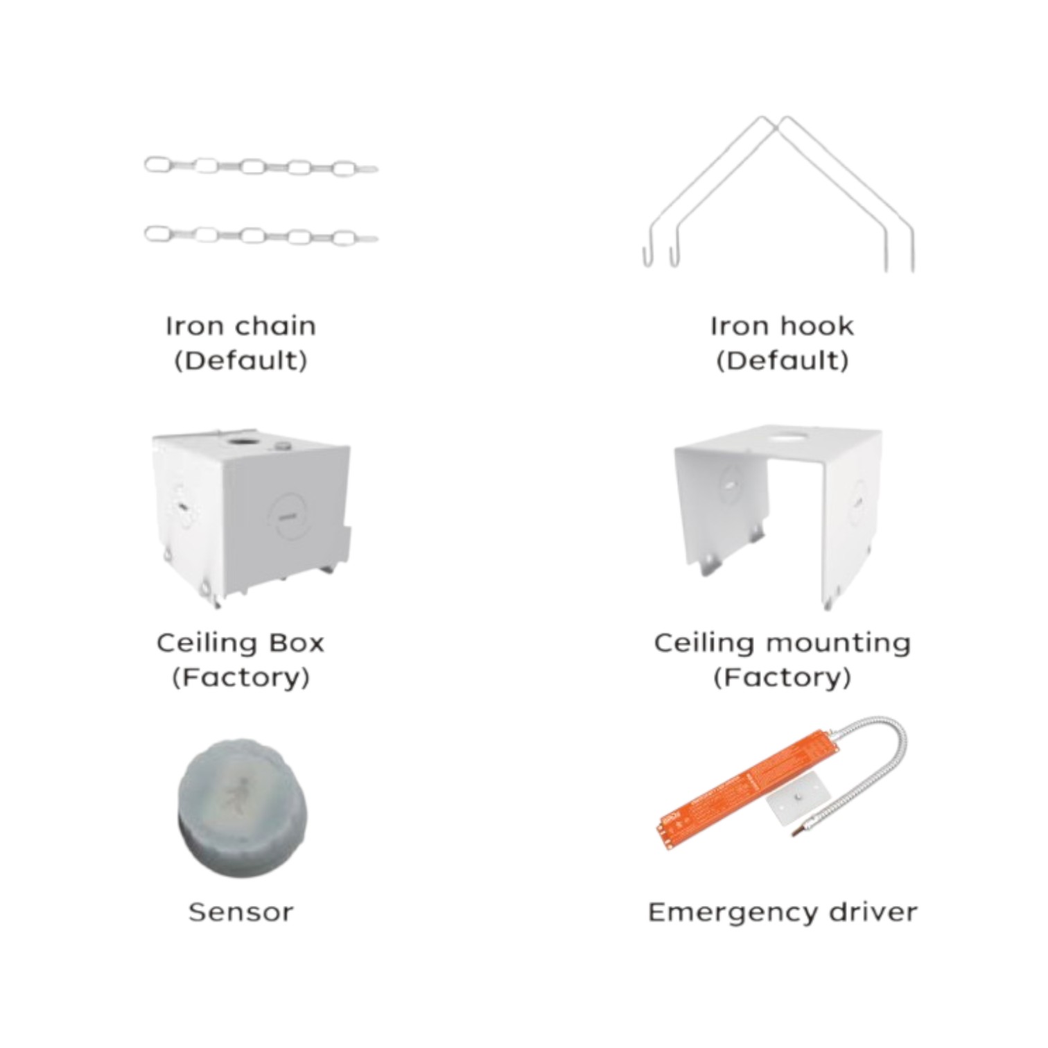LED linear high bay fixture, steel wire-rope suspension kit (default), installation guide. Surface-mount kit, sensor, and emergency battery sold separately.