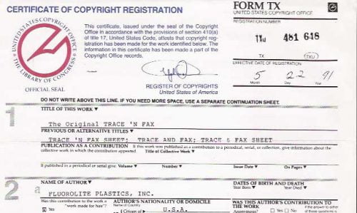 Here is a copy of the top half of our Copyright Registration for the Trace n’ Fax form. Filed in 1991,